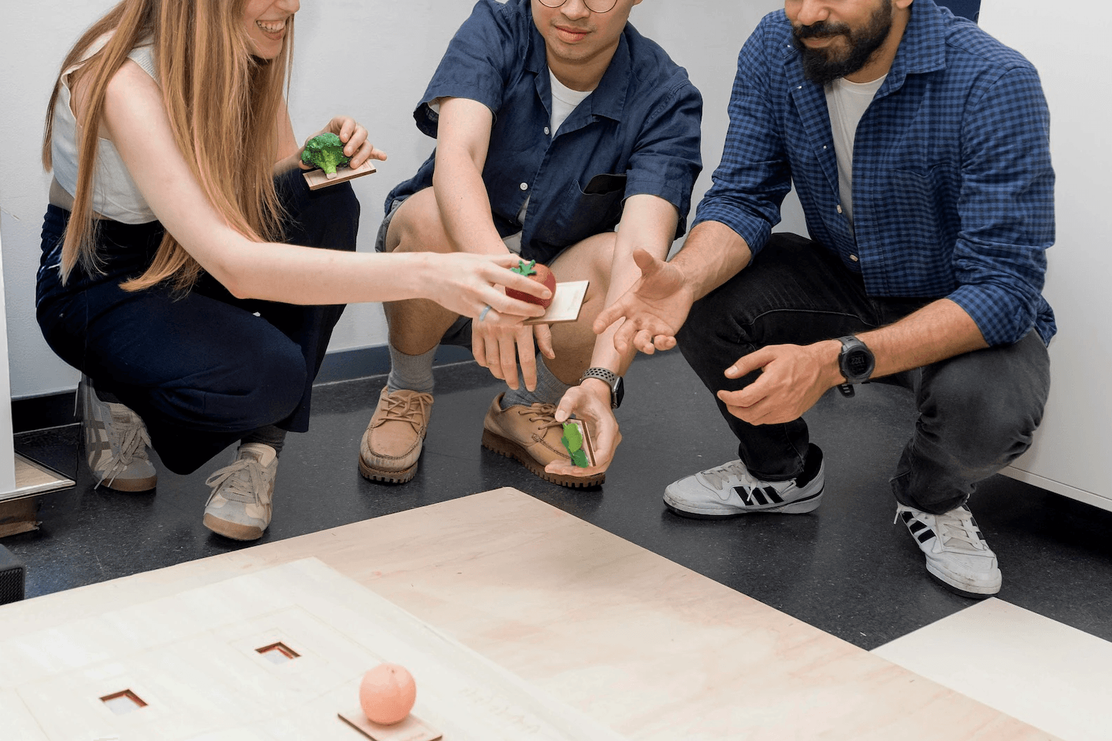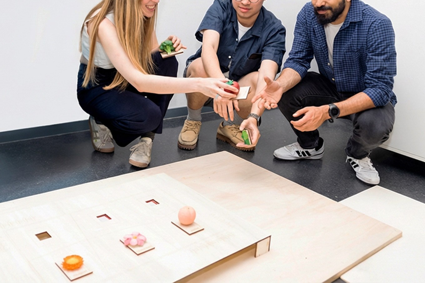 The experience happens on a wooden board representing a farm divided into zones. Players place plant tokens in different sections. Each token has an RFID tag that communicates with ItsyBitsy microcontrollers when placed on the board. The signal travels through an MQTT server to the main controller loaded with audio files, which decides which conversation to trigger. Place basil next to tomato and Basil explains how its aroma keeps pests away while Tomato describes the shade it provides so Basil doesn't dry out. Animations project onto the wooden floor, changing as plants move closer together. The neighborhood rebuilds visually while visitors learn which plants help each other survive.