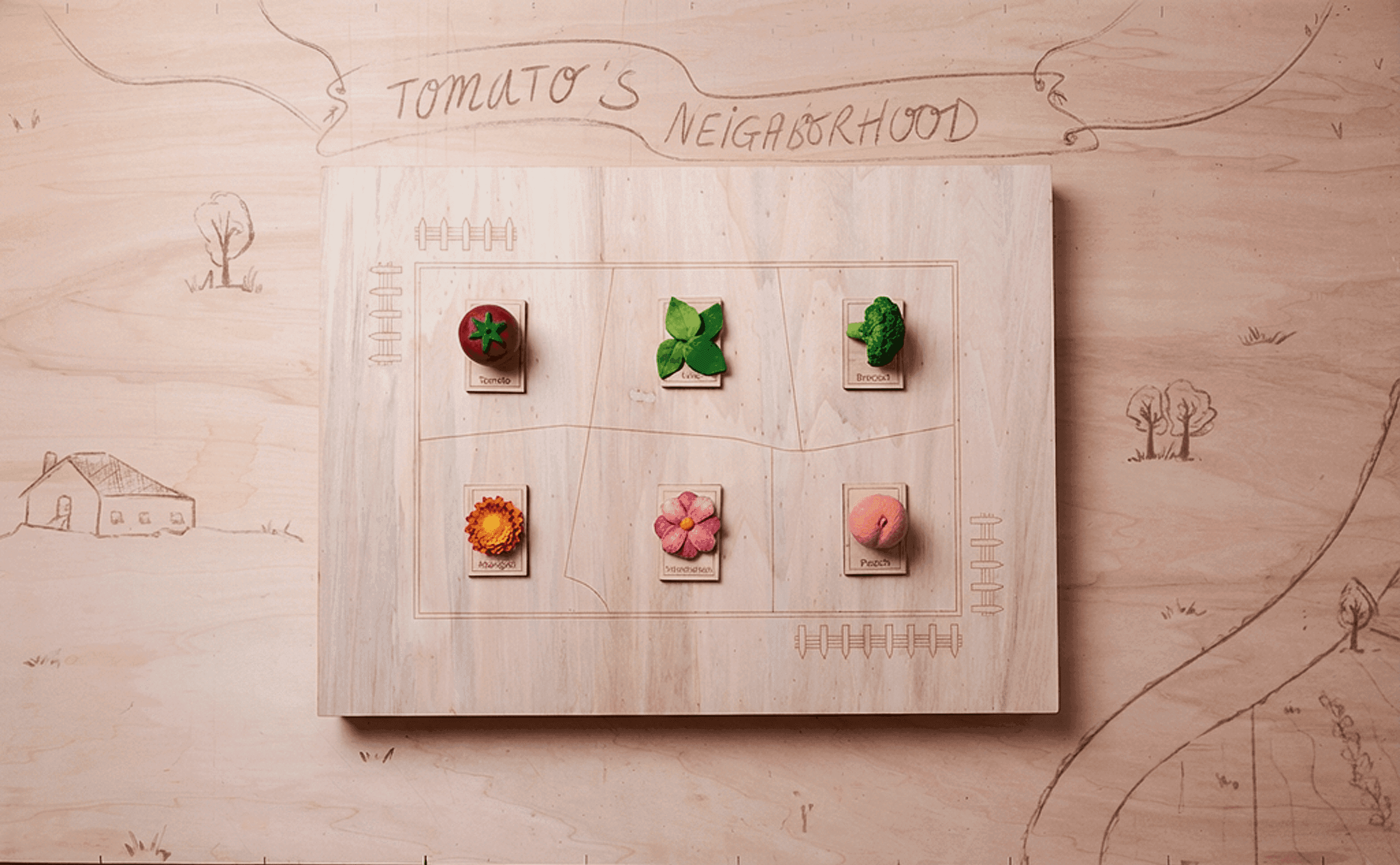 Monocropping destroyed the farm's ecosystem. What used to be a diverse neighborhood where plants supported each other became rows of only tomatoes. The soil degraded, flavors weakened, the system broke down. The challenge: help tomato by placing the right plants around it so they can support each other again.