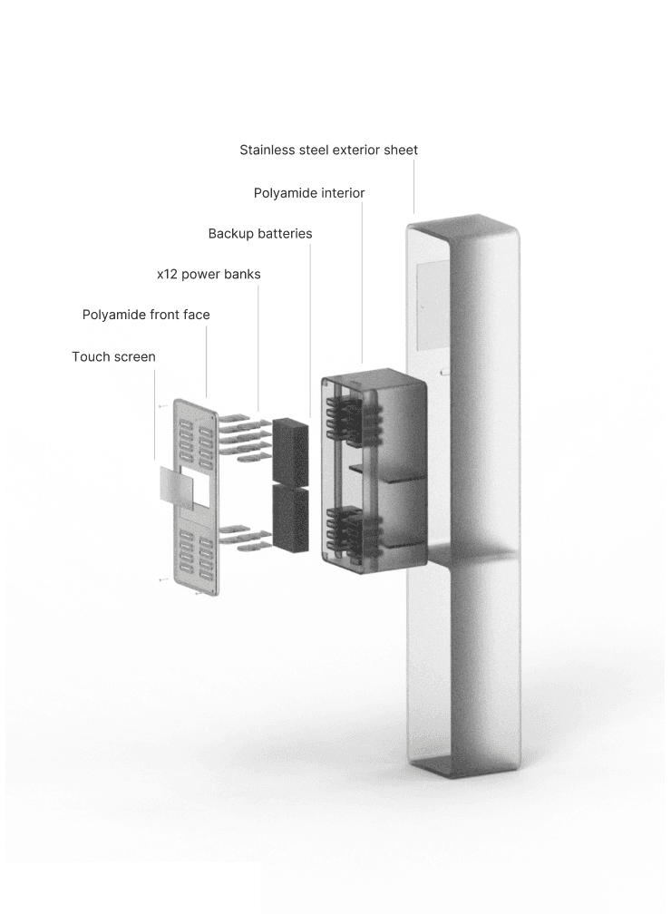We developed three connected parts: the power banks users carry, the charging stations where they're stored, and the app that makes the whole system work. Each part had different requirements, but they all needed to feel like they belonged to the same system.